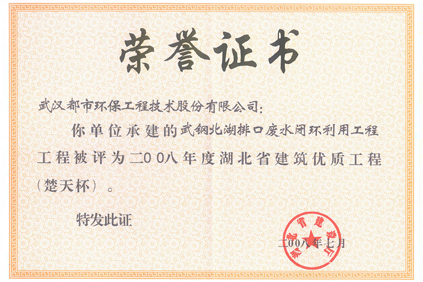 北湖排水项目楚天杯荣誉证书