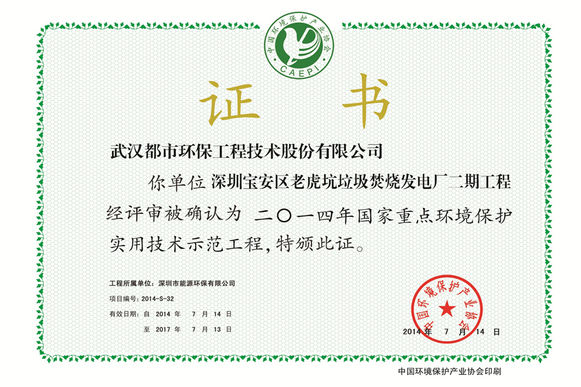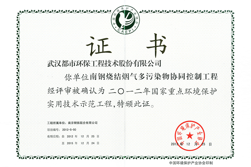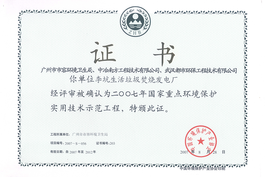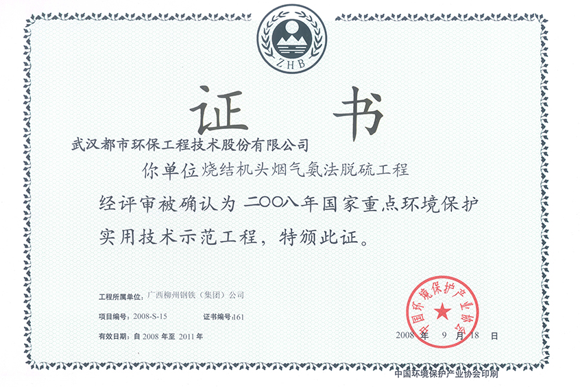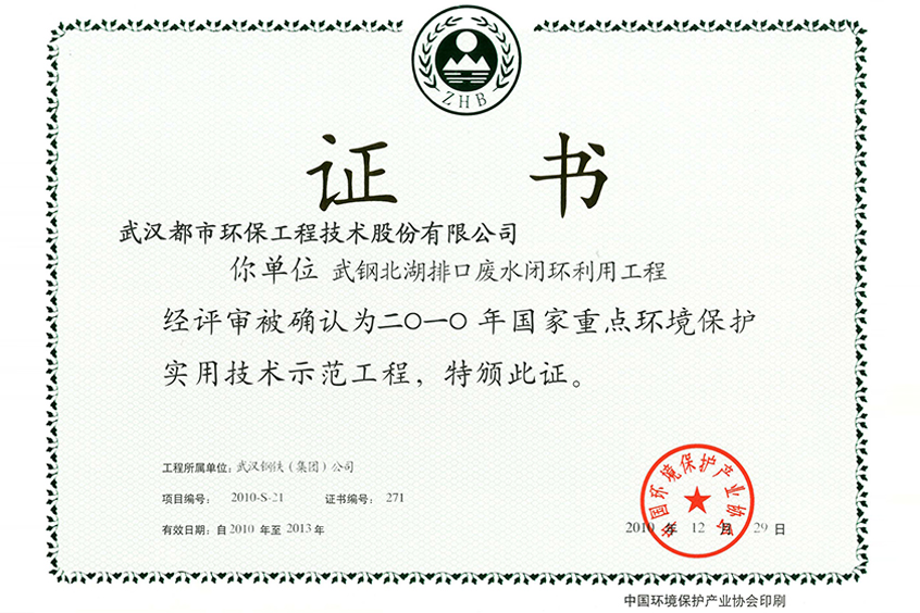 武钢北湖示范工程证书(2010)