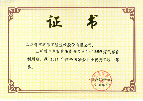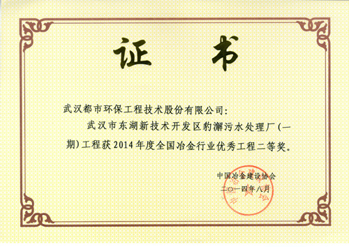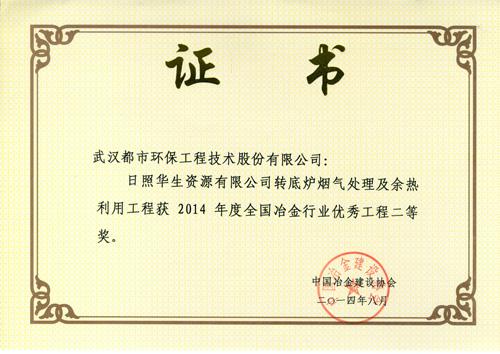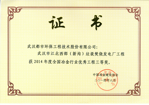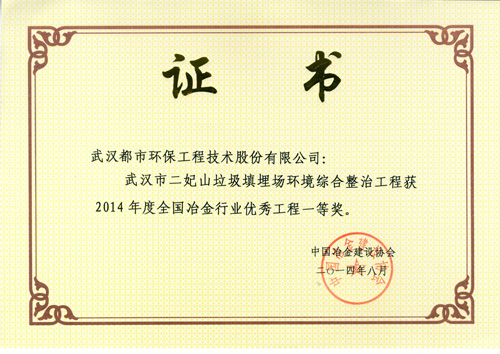 ??? 都市环保公司申报的“五矿营口中板有限责任公司1×135MW煤气综合利用电厂”、“武汉市二妃山垃圾填埋场环境综合整治工程”设计项目获得2014年度全国冶金行业优秀工程设计一等奖;“日照华生资源有限公司转底炉烟气处理及余热利用工程”、“日照钢铁有限公司6x180m2烧结余热发电工程”、“武汉市东湖新技术开发区豹澥污水处理厂(一期)工程”设计项目获得2014年度全国冶金行业优秀工程设计二等奖、“武汉市江北西部(新沟)垃圾焚烧发电厂工程”设计项目获得2014年度全国冶金行业优秀工程设计三等奖。参与上述四个项目的主要人员(83人/次)获得荣誉证书。