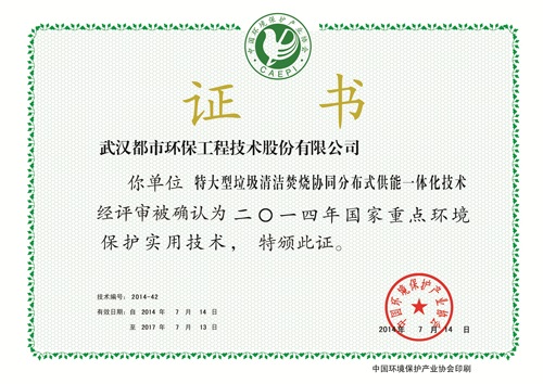??? 经过都市环保公司申报、湖北省环境保护产业协会推荐、中国环境保护产业协会组织专家进行了评审和现场验收。在进行网上公示后,中国环境保护产业协会《关于发布2014年国家重点环境保护实用技术及示范工程名录(第一批)的通知》(中环协〔2014〕46号)发布: “深圳宝安区老虎坑垃圾焚烧发电厂二期工程”?被评为2014年国家重点环境保护实用技术示范工程,“特大型垃圾清洁焚烧协同分布式供能一体化技术”?被评为2014年国家重点环境保护实用技术。