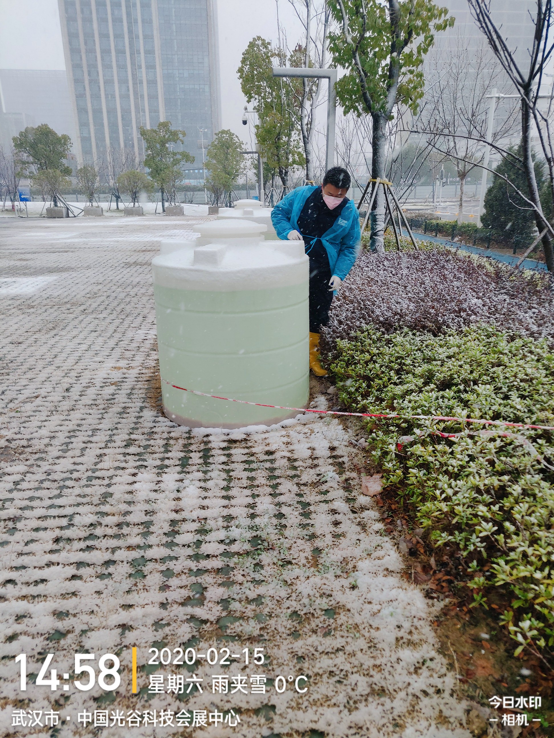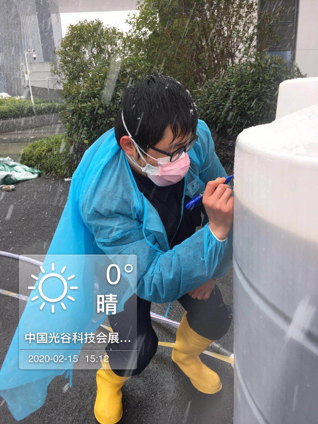 为确保光谷科技会展中心方舱医院15日晚正式投用,16日正式接收新冠肺炎病人,无数逆行者不畏疫情,不畏严寒,正在进行最后的冲刺。而都市环保也有这样一群逆行的人,战斗在“抗疫”前线。为确保方舱医院尾水消杀满足要求,尽量降低新冠病毒通过粪口传播的风险,方舱医院的尾水必须实行三级消毒,为确保尾水消毒设施能如期正常运行,15日下午,都市环保方舱医院尾水消毒突击队员顶风冒雪,在光谷科技会展中心对化粪池和市政污水管网入口处的消毒设施进行最后的检查和调试。“1号加药罐流量正常”,“3号加药罐阀门调小一点”,“所有管道没有结冰,可以运行”……随着风雪中一声声铿锵有力的声音,尾水消毒调试工作全部完成,正式开始投药。