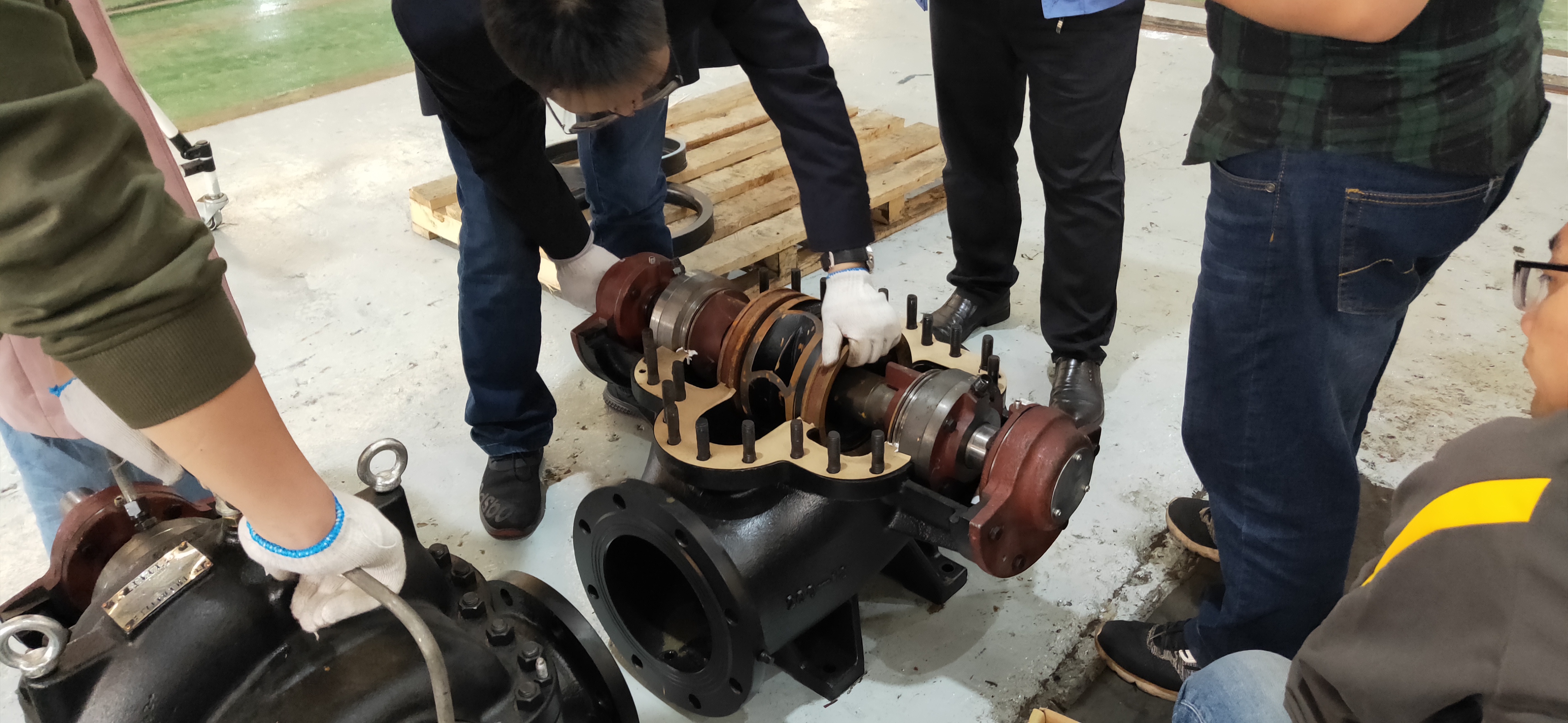 在了解了水泵的基本构造后,我司人员每四人一组动手操作,对双吸泵、小型潜污泵进行现场拆解,直观具体地了解了水泵内部零部件,加深了对水泵整体结构的认识。